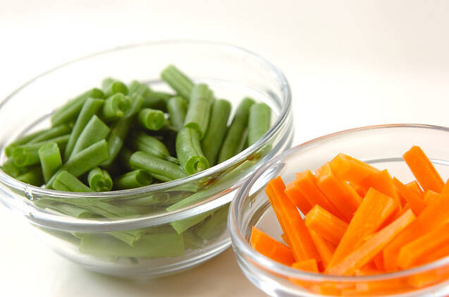 サヤインゲンは軸を少し切り落とし、長さ3〜4cmに切る。