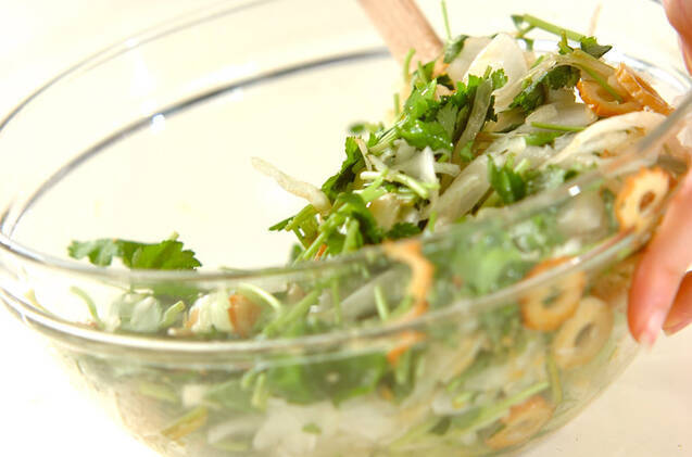 <和えダレ>の材料を混ぜ合わせ、食べる直前に全ての材料を和えて、器に盛り分ける。