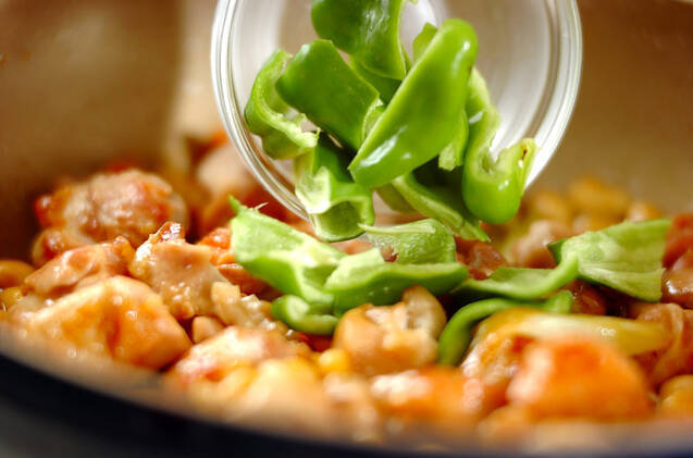 ピーマンを加えて1~2分煮、器に盛って一味唐辛子を振る。