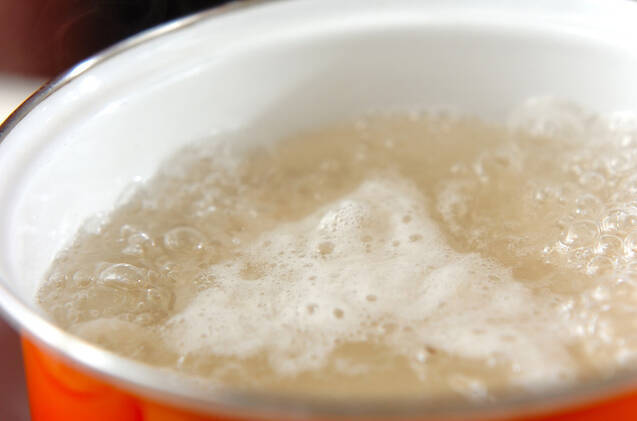 レンコンは皮をむいて厚さ3mmの輪切りにし、酢、塩を加えた熱湯でレンコンが少し透き通るまでゆで、ザルに上げて水気をきる。