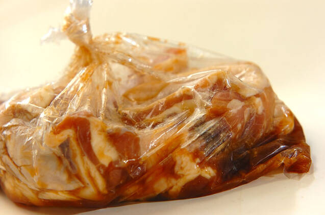 鶏もも肉は大きめのひとくち大に切る。鶏もも肉を混ぜ合わせた<調味料>の材料と合わせ、ビニール袋に入れて一晩漬けこむ。
