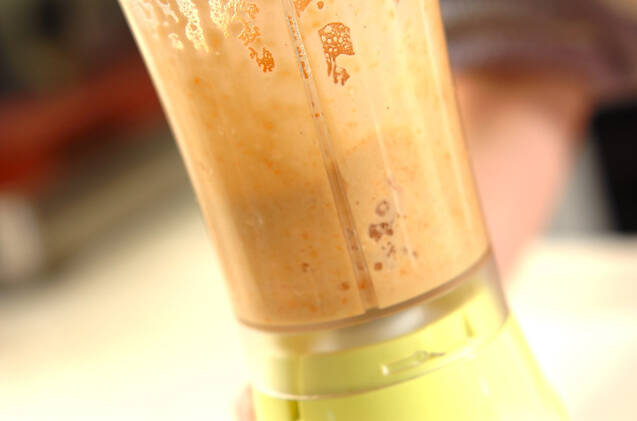 <ドレッシング>のニンジンは皮をむき、新玉ネギと一緒にザク切りにする。全ての材料を合わせてミキサー等でかくはんする。残ったドレッシングは冷蔵庫で保存してください、3~4日使えます。