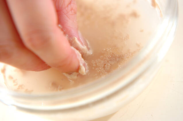 ぬるま湯を材料分から少量取り分け、イーストを振り入れ、指先ですり合わせて溶かす。