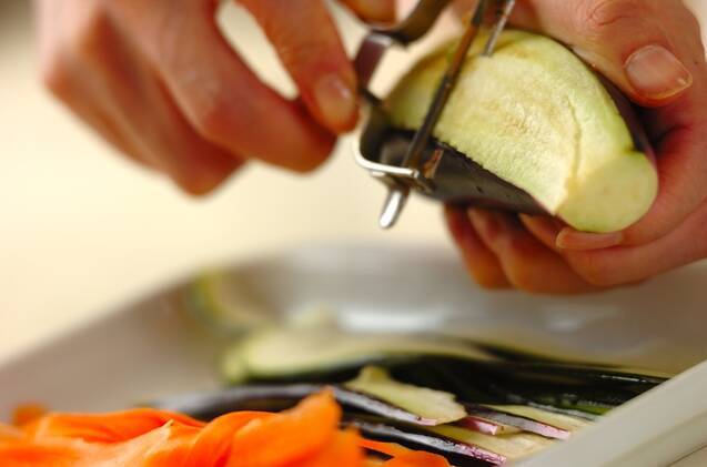 ニンジン、ナス、ズッキーニはスライサーで薄くスライスする。1~1.5cm幅の細長いリボン状にし、軽く塩を振ってしばらく置き、水気を拭き取る。