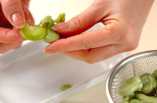 塩を入れた熱湯にソラ豆を入れ、サッとゆでてザルに上げ、粗熱が取れたら豆の黒い部分から優しく外皮をむく。