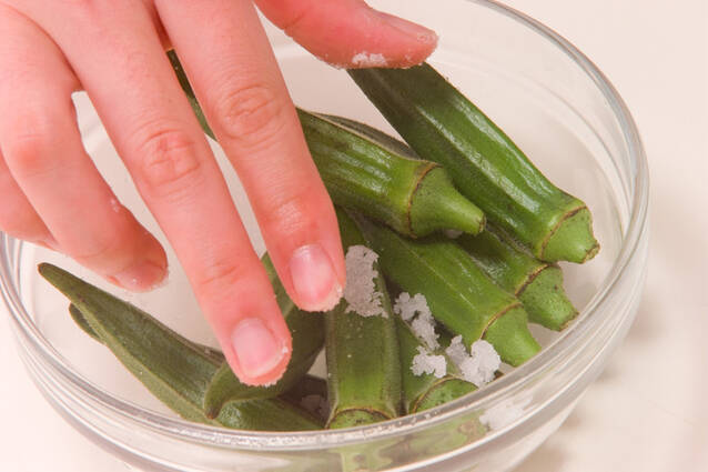 長芋は皮をむき、半分の長さに切って水に放ち、5分置いてキッチンペーパーで水気を拭き取る。