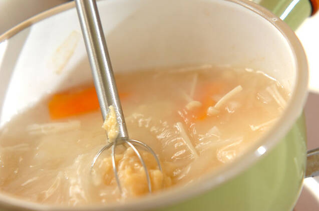 野菜が柔らかくなったらお餅、エノキを入れ、白みそを溶き入れる。