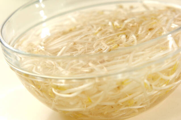 モヤシはたっぷりの水に放ち、シャキッとしたらザルに上げる。