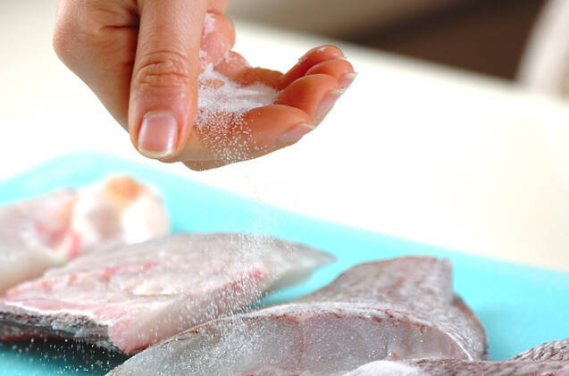 鯛は両面に酒をかけ、振り塩をする。(ヒント)振り塩とは、魚の20~30cm上より指の間から塩を落として、魚全体に塩を振ること。魚から距離を離すことで、まんべんなく全体に塩を振ることができます。
