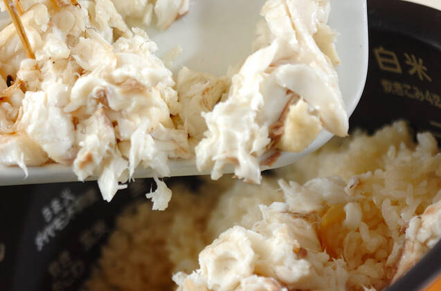 炊き上がったら昆布ごと鯛を皿に取り出し、鯛をほぐして骨と皮をていねいに取り除き、身は炊飯器に戻して全体に混ぜ合わせる。