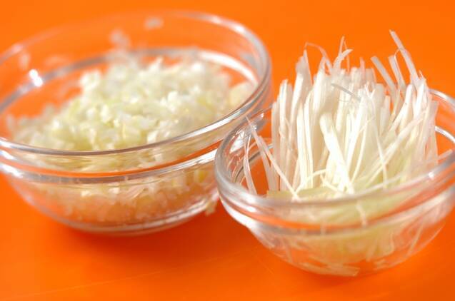 白ネギは1/2本はみじん切りにし、残りは白髪ネギにする。鍋に<甘酢あん>の材料を入れて混ぜ、弱火にかけてよく混ぜながらトロミをつけ、最後にゴマ油を加える。