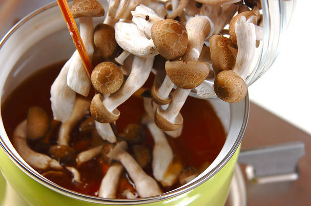 <あん掛けだし>の材料を鍋に入れて強火にかけ、煮立ったらシメジを加え、しんなりしたら混ぜながら<だし溶き片栗>を加える。