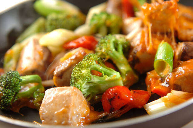 <調味料>を加え、トロミがつくまで全体にからめながら炒め、器に盛る。