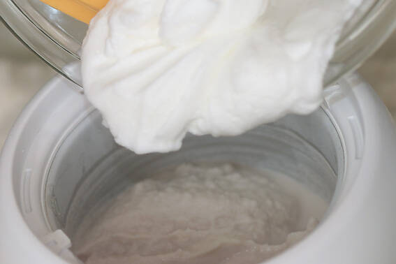 3が少しシャーベット状になってきたら(12~13分後)、<イタリアンメレンゲ>を加える。再びアイスクリームメーカーをセットして撹拌し、約7分後に完成!