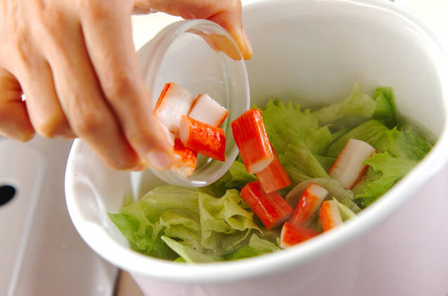 鍋に<スープ>の材料を入れて強火にかけ、煮たったらレタス、カニ風味カマボコ、ショウガ汁を加え、塩コショウで味を調えて器に注ぐ。