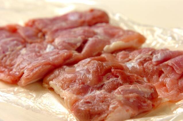 鶏もも肉は太い筋と余分な脂を取り除き、塩をもみ込み半日以上漬ける。