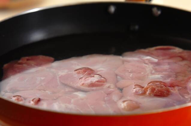 鶏もも肉は皮面を下にして鍋に入れ、酒、かぶる位の水を注ぎ入れて中火にかける。煮たったら弱火にし、10分ゆでて火を止める。