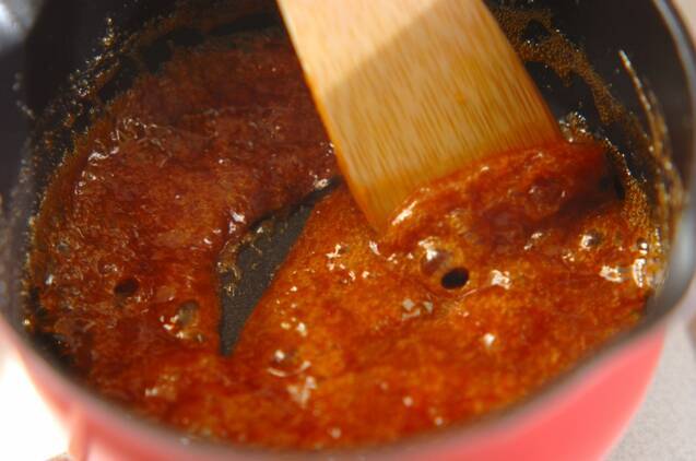 小鍋に<みそダレ>の材料を入れて混ぜ合わせ、混ぜながら弱めの中火にかける。トロミがついたら火を止める。