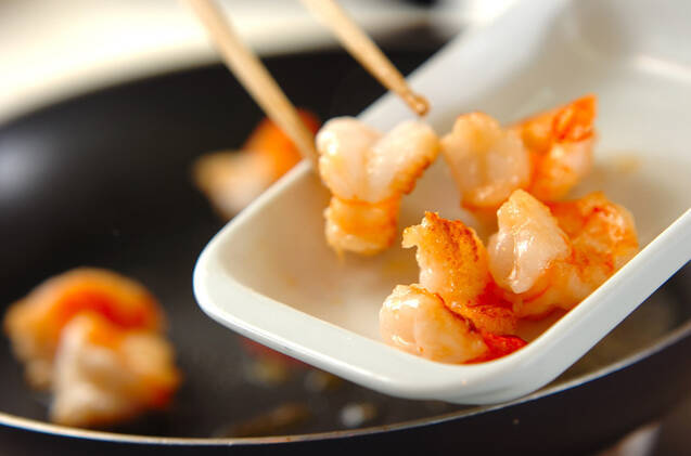 フライパンにサラダ油を中火で熱し、エビを両面色が変わるまで炒め、いったん取り出す。