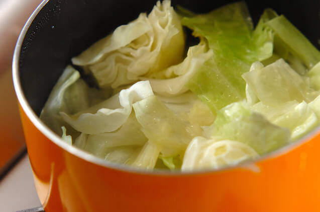 キャベツはザク切りにし、玉ネギは縦薄切りにし、鍋に入れる。水、塩を加えて火にかけ、煮たったら火を弱めて鍋に蓋をし、15分蒸し煮にして火を止める。