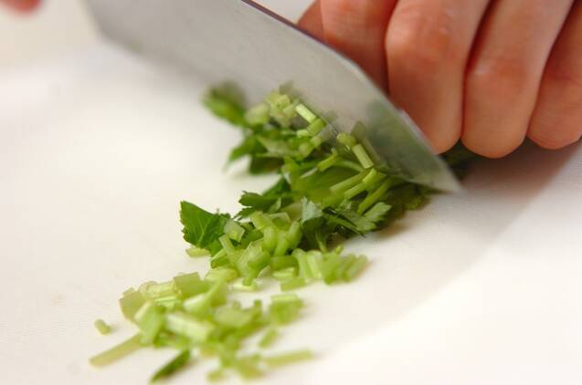 ミツバは水洗いして根元を切り落とし、粗く刻む。