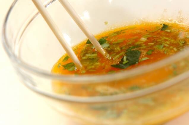 ボウルに卵を溶き入れ、<調味料>の材料、シラス干し、ミツバを加えて混ぜ合わせる。