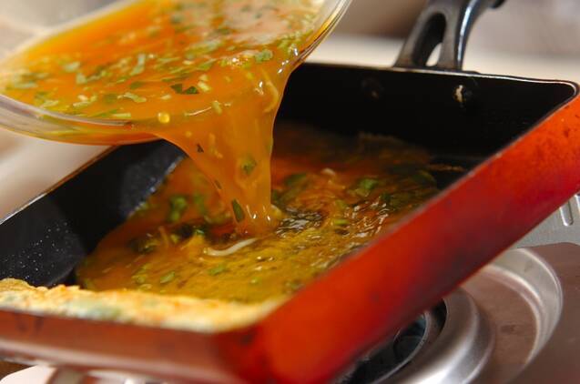 サラダ油を全体に薄くひき、残りの卵液の半量を流し入れ、巻いた卵を菜ばしで持ち上げてその下にも卵液を流し込む。