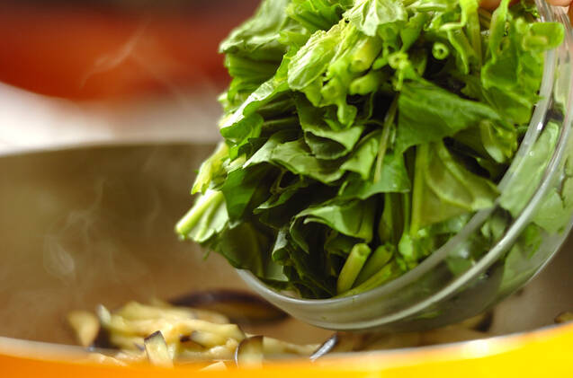 ナスに焼き色がついてきたら、ホウレン草を加えて炒め合わせる。塩コショウで味を調え、器に盛る。