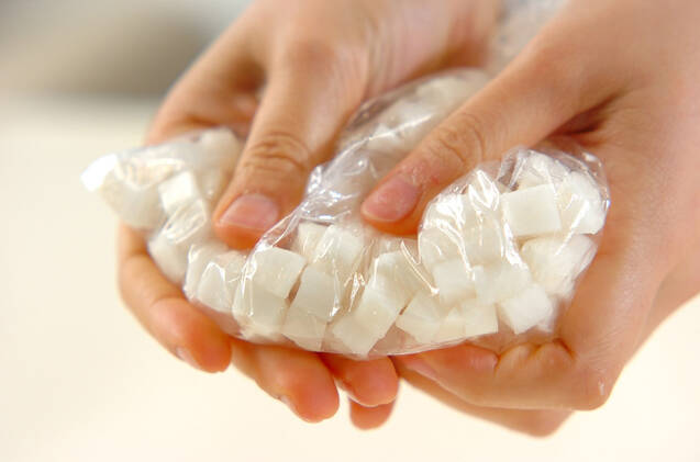 大根は皮をむき、1cm角に切る。ビニール袋に塩と共に入れてよく塩をもみ込み、水気が出てきたらしっかり絞る。