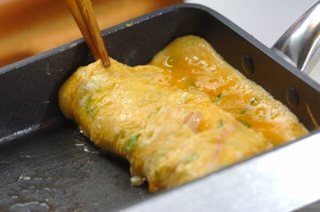 卵焼き器を中火で熱し、ゴマ油を薄くひき、卵液の1/3量を流し入れて全体に広げる。周りがかたまってきたら奥側から手前に巻き、巻き終わったら奥側へ寄せる。