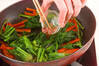 ホウレン草は特に根元をきれいに水洗いし、たっぷりの熱湯でサッとゆで、水に取り粗熱が取れれば水気を絞って4cmの長さに切る。