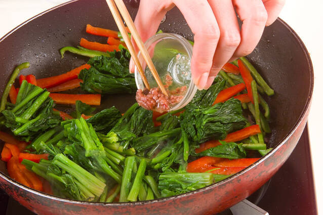 ホウレン草を加えて全体に炒めあわせれば、残りのアンチョビを加え、塩コショウで味を調えて火を止め、器に盛り付ける。