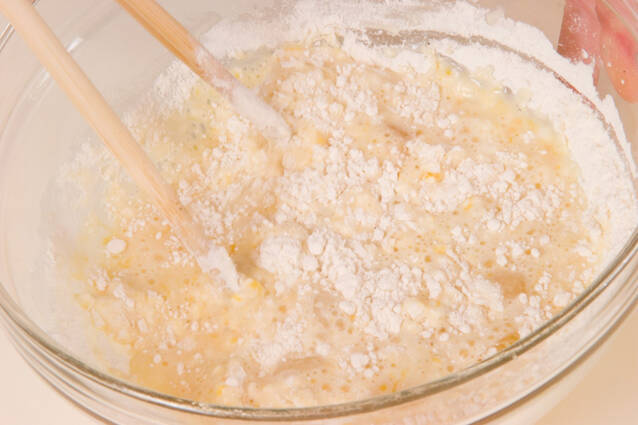 ボウルに<衣>の卵黄と冷水を混ぜ合わせ、小麦粉を加え、サックリと粉が残る程度に手早く混ぜる。