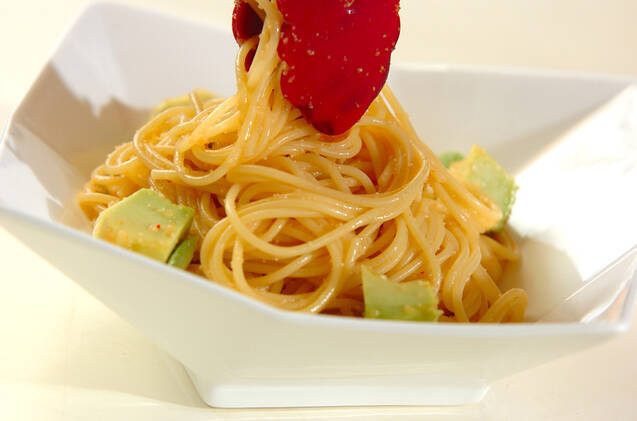 ゆで上がったスパゲティー、アボカドを(3)に加えて混ぜ合わせ、器に盛る。