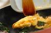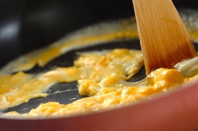 フライパンにバターを半量入れて中火で熱し、溶けたら<卵液>を流し入れて炒める。半熟になったらいったん取り出す。