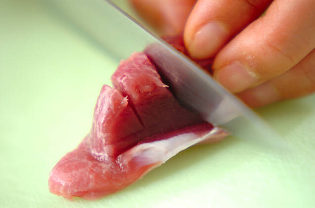 鶏もも肉は細切りにする。砂肝は白い部分を削ぎ落とし、身の厚い部分に切り込みを入れる。ミルびき岩塩、コショウを全体に振る。