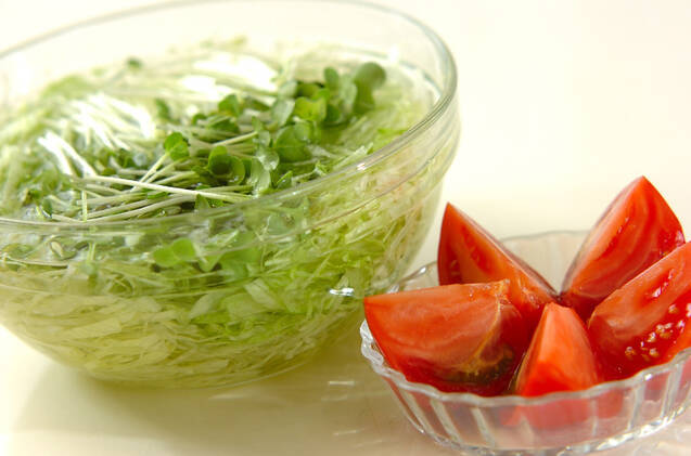 貝われ菜は根元を切り落とし、水洗いして長さを半分に切り、レタスと合わせておく。フルーツトマトはヘタをくり抜き、皮をむいて食べやすい大きさのくし切りにする。