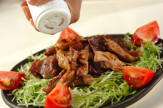 器に合わせたレタスを広げ、2の鶏もも肉、砂肝を焼き汁ごとのせてフルーツトマトを添え、お好みでミルびき岩塩を振る。