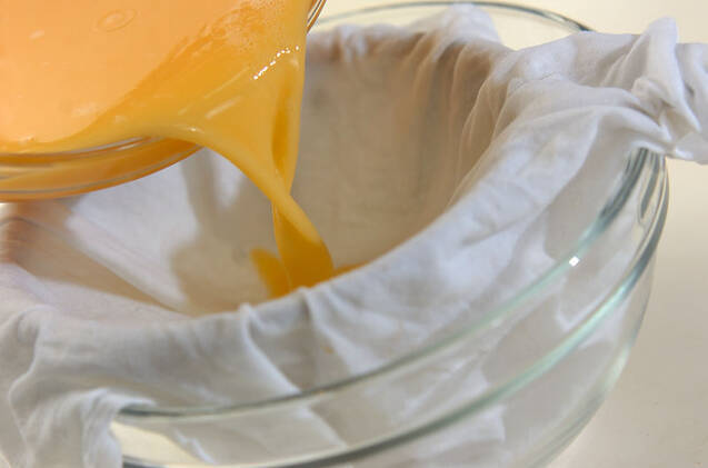 卵を溶きほぐし、<合わせだし>の材料と混ぜ合わせる。一度かたく絞ったぬれ布巾でこし、なめらかにし、器に分ける。