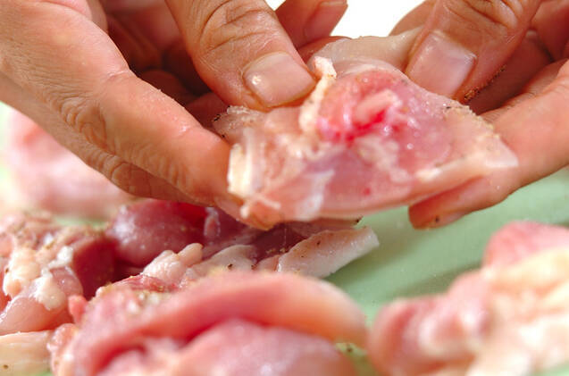 鶏もも肉はひとくち大に切り、塩コショウをすり込み、さらに小麦粉を薄くつける。