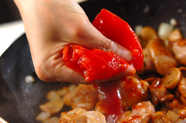 玉ネギが透き通ってきたら、マッシュルームを加えて炒め合わせ、<ソース>の材料を加える。(ヒント)水煮トマトがホールの場合は、手でつぶしながら加えて下さい。