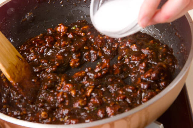 <肉みそ>を作る。フライパンにゴマ油を中火で熱し、鶏ひき肉を炒める。ポロポロになればピーナッツバター以外の材料を加えて炒めあわせる。