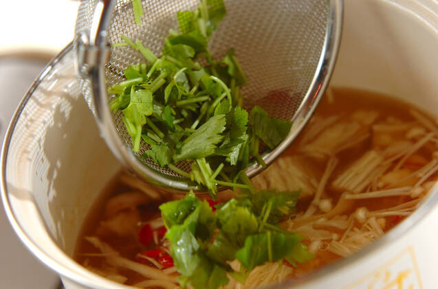 レモン汁、ミツバを加えて火を止め、器に注ぎ分ける。