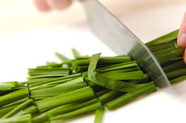 ニラは根元を切り落として長さ2cmに切り、<卵液>の材料と混ぜ合わせる。