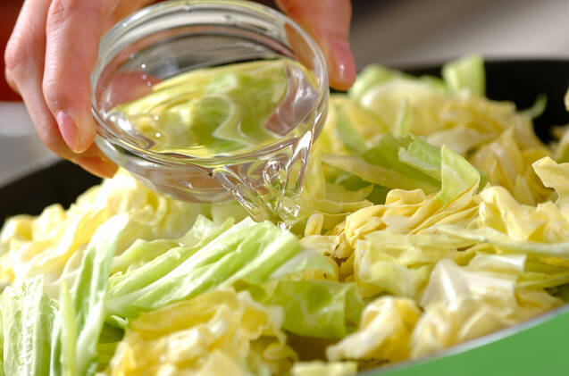 深めのフライパンにアサリ、キャベツ、酒を入れ、蓋をして強火にかける。