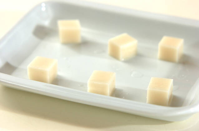 耐熱皿に水でぬらしたお餅を重ならないように並べ、ラップをかけて電子レンジで30秒加熱し、柔らかくする。電子レンジは600Wを使用しています。