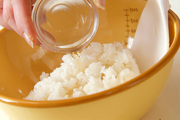 海苔は半分に切る。炊きたてご飯に作り置き甘酢を混ぜ合わせ、更に白ゴマを混ぜ合わせる。