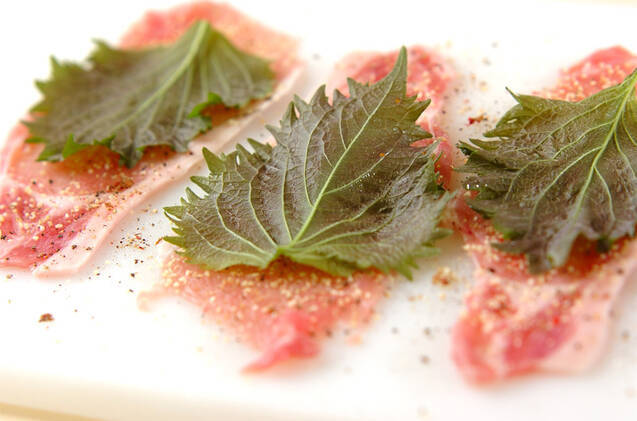 豚肉は1枚ずつまな板に広げ、ガーリックパウダー、塩コショウを振る。大葉はサッと水洗いして水気を拭き取り、軸を取って豚肉に重ねる。