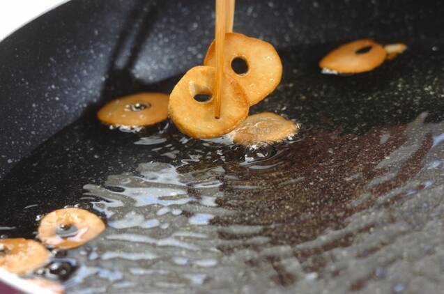 フライパンにサラダ油を深さ2cm位まで注ぎ、ニンニクを入れて中火にかける。香りがたって茶色に色付いたら取り出す。