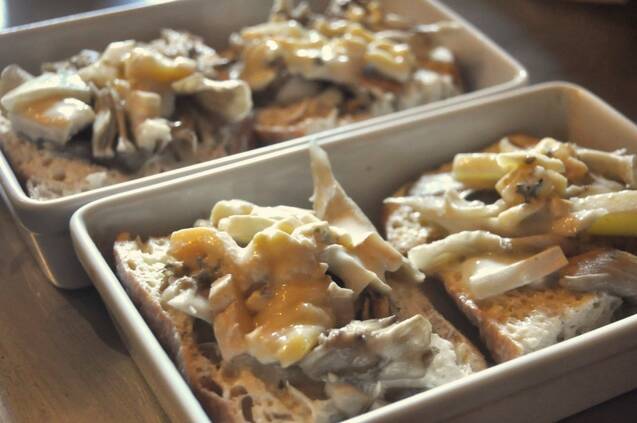 耐熱容器にバゲットを並べ、(1)とピザ用チーズをのせる。ボウルに<卵液>が残ればバゲットの上からかける。